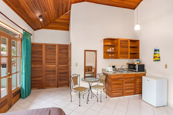 Todo lo que necesitas para hacer sus propias comidas ligeras y disfrutar del café de la mañana en su balcón privado. Barra de desayuno equipada con mini refrigerador, cafetera, tostador y micro-onda. Equipado con una cama queen y un sofá cama individual. Todas nuestras suites junior se encuentran en el segundo piso.
